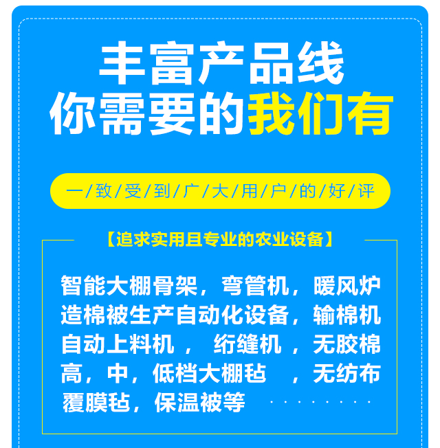 本公司設(shè)備齊全,可生產(chǎn)智能大棚骨架,彎管機,暖風(fēng)爐等農(nóng)業(yè)設(shè)備,另制造棉被生產(chǎn)自動化設(shè)備,自動上料機,輸棉機,絎縫機等。質(zhì)量可靠,注重創(chuàng)新。公司擁有雄厚的實力,先進的生產(chǎn)線,豐富的經(jīng)驗,可根據(jù)客戶的要求定做高,中,低檔大棚氈,無紡布,無膠棉,覆膜氈,保溫被等,車間日生產(chǎn)新型棉被10000平方米以上,能滿足各種客戶的需求,新型保溫被產(chǎn)品在國內(nèi)研發(fā)中始終保持在前列。